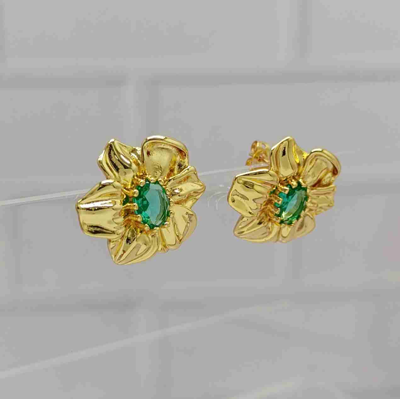 Un diseño delicado que combina brillo y elegancia 🌸. Elaborados en rodio con un toque central de cristal verde tipo esmeralda. Disponibles en plateado y dorado.
